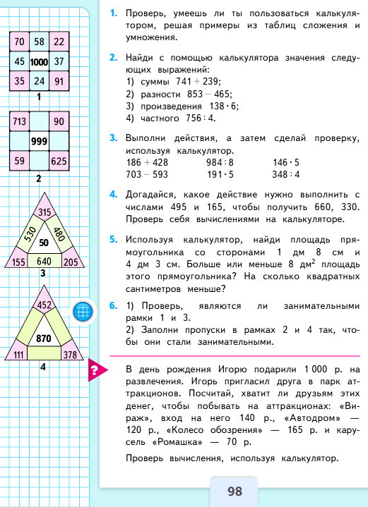 В день рождения Игорю подарили 1000 р. на развлечения. Игорь пригласил друга в парк аттракционов. Посчитай, хватит ли друзьям этих денег, чтобы побывать на аттракционах: «Вираж», вход на него 140 р., «Автодром» – 120 р., «Колесо обозрения» – 165 р. и карусель «Ромашка» – 70 р. Проверь вычисления, используя калькулятор.